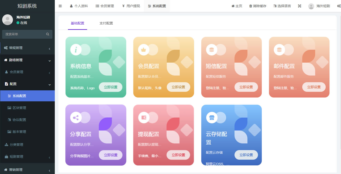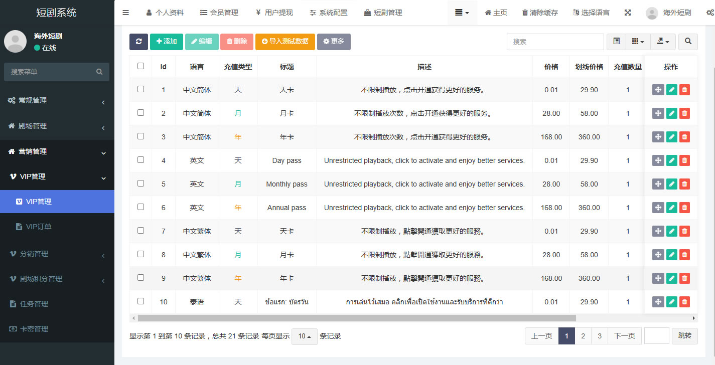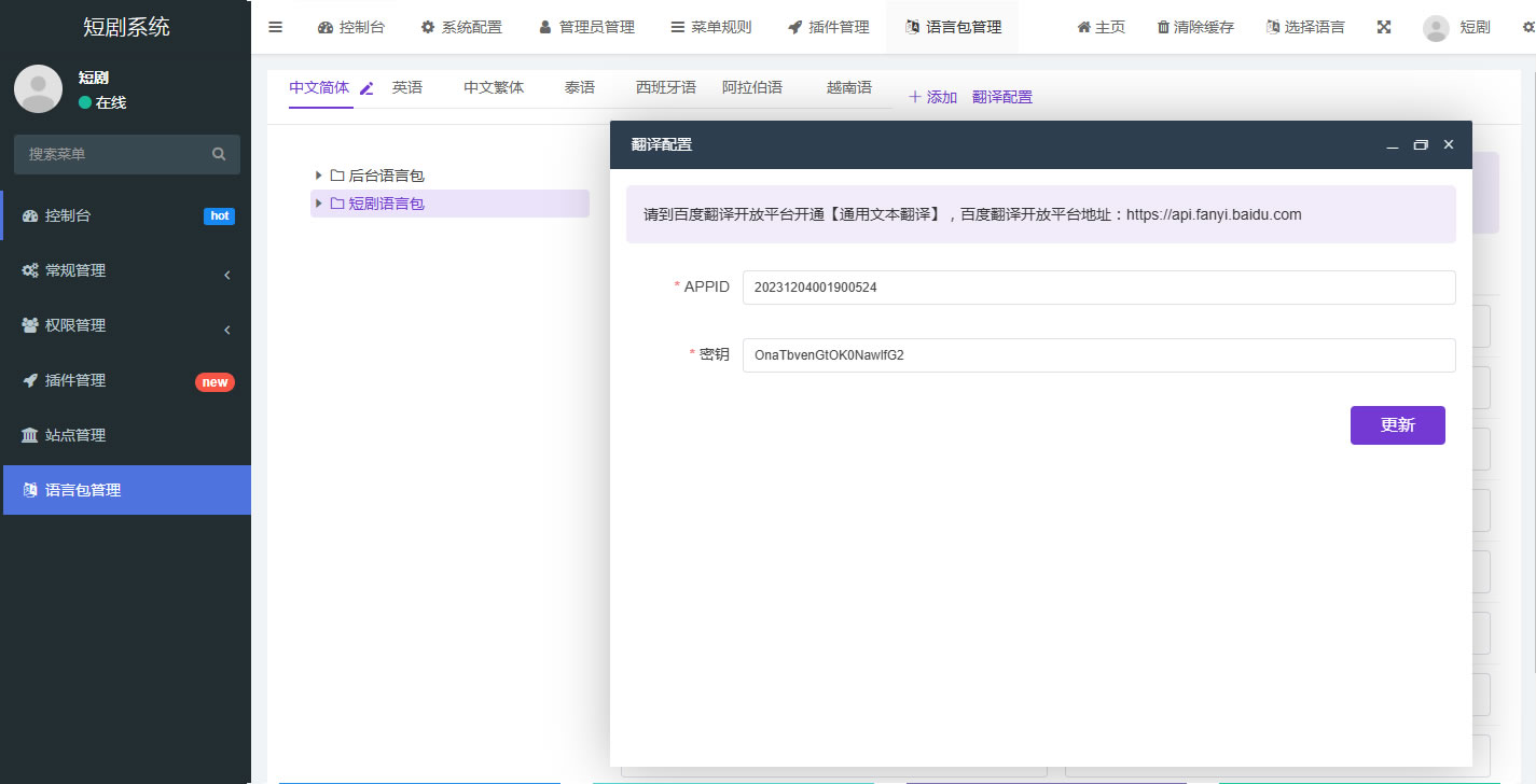 15,后台升级开发了多语言包,可以做海外任何国家或多个国家的短剧平台
